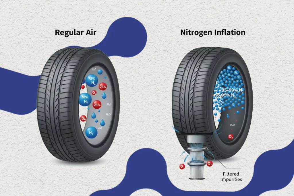 چون نیتروژن توانایی بیشتری در دفع و کنترل گرما دارد، لاستیک در مسیرهای طولانی یا شرایط داغ کمتر داغ میکند و احتمال ترکیدن آن بهطور چشمگیری پایین میآید. از طرفی داخل نیتروژن رطوبت و اکسیژن وجود ندارد. به همین دلیل وقتی دمای هوا تغییر میکند، فشار لاستیک کمتر دچار نوسان میشود. این ثبات فشار باعث میشود نیتروژن برای خودروهایی که تحت فشار یا سرعت بالا کار میکنند—مثل ماشینهای مسابقه—گزینهای مطمئنتر باشد.