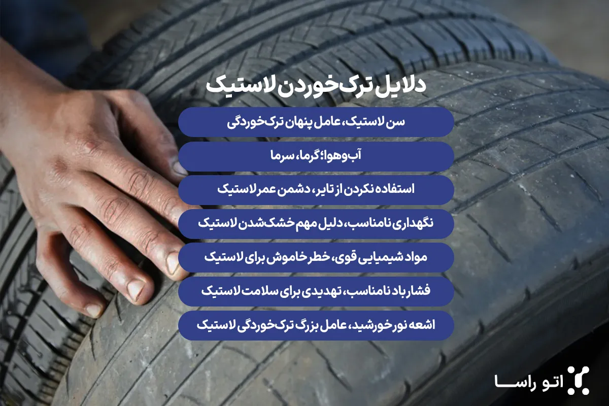 برای جلوگیری از خشک شدن لاستیک باید با دلایل ایجاد این مشکل بیشتر آشنا شوید. معمولا خشکشدن لاستیک بهدلیل عوامل مختلفی مانند سن، شرایط آبوهوایی، نحوه نگهداری و حتی شیوه رانندگی رخ میدهد. در زیر این دلایل را بیشتر بررسی کردهایم: